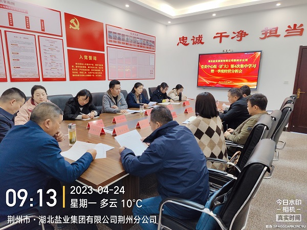 4月24日,湖北鹽業(yè)集團(tuán)有限公司荊州分公司召開黨委中心組(擴(kuò)大)第4次集中學(xué)習(xí)暨一季度經(jīng)營分析會,領(lǐng)導(dǎo)班子成員、縣市分公司及營銷中心主要負(fù)責(zé)人,機(jī)關(guān)中層干部參加。會議由黨委委員、副總經(jīng)理陳菊娥主持。