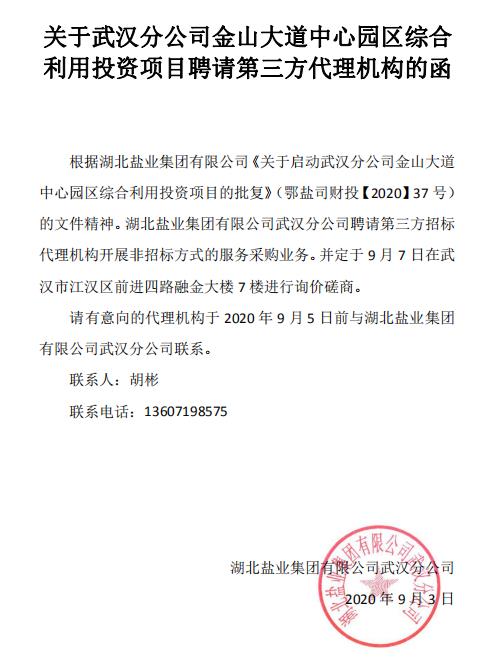 關(guān)于武漢分公司金山大道中心園區(qū)綜合利用投資項目聘請第三方招標代理機構(gòu)的函.pdf -