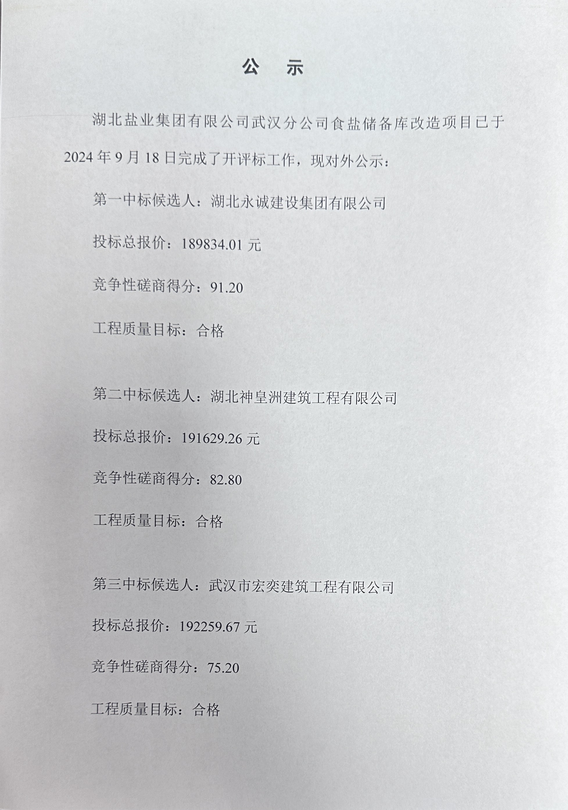 公示(湖北鹽業(yè)集團(tuán)有限公司武漢分公司食鹽儲(chǔ)備庫(kù)改造項(xiàng)目 招標(biāo)結(jié)果)
