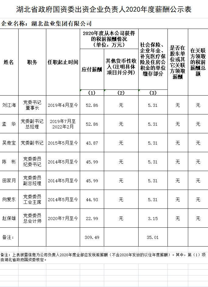 湖北省政府國資委出資企業(yè)負責人2020年度薪酬公示