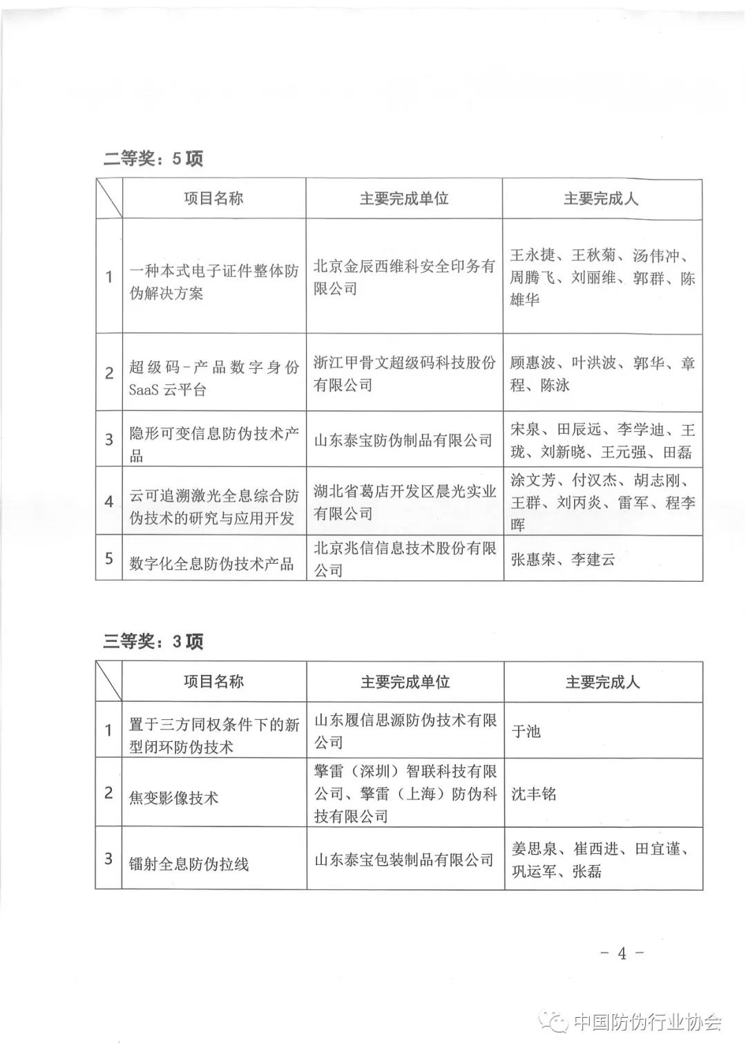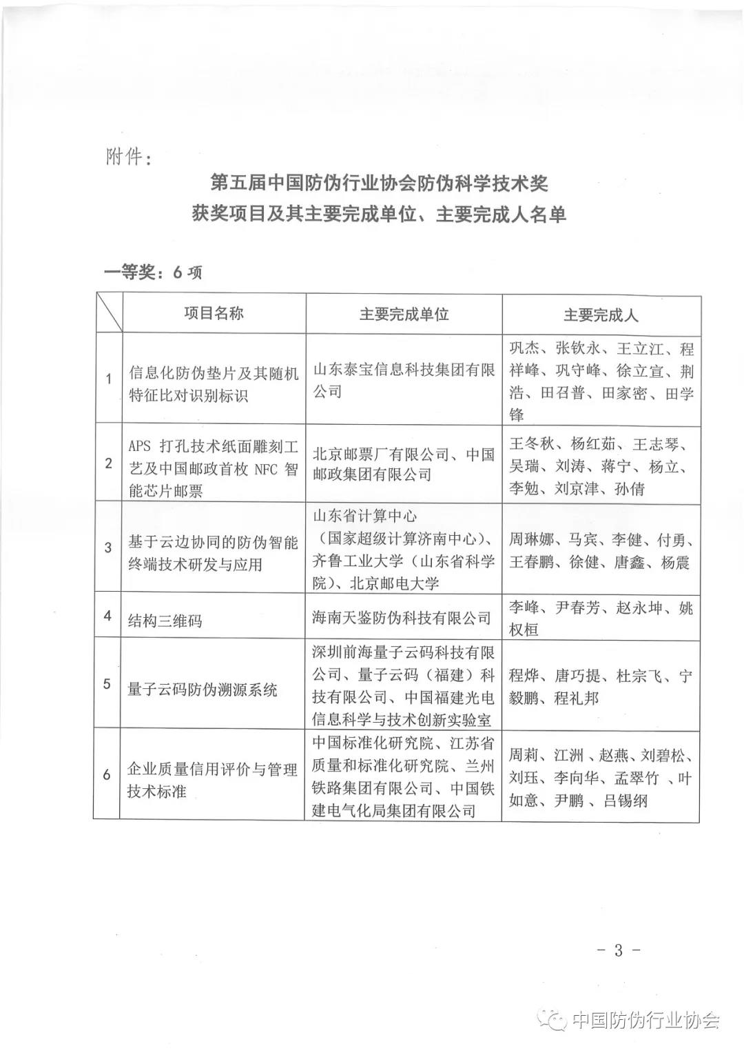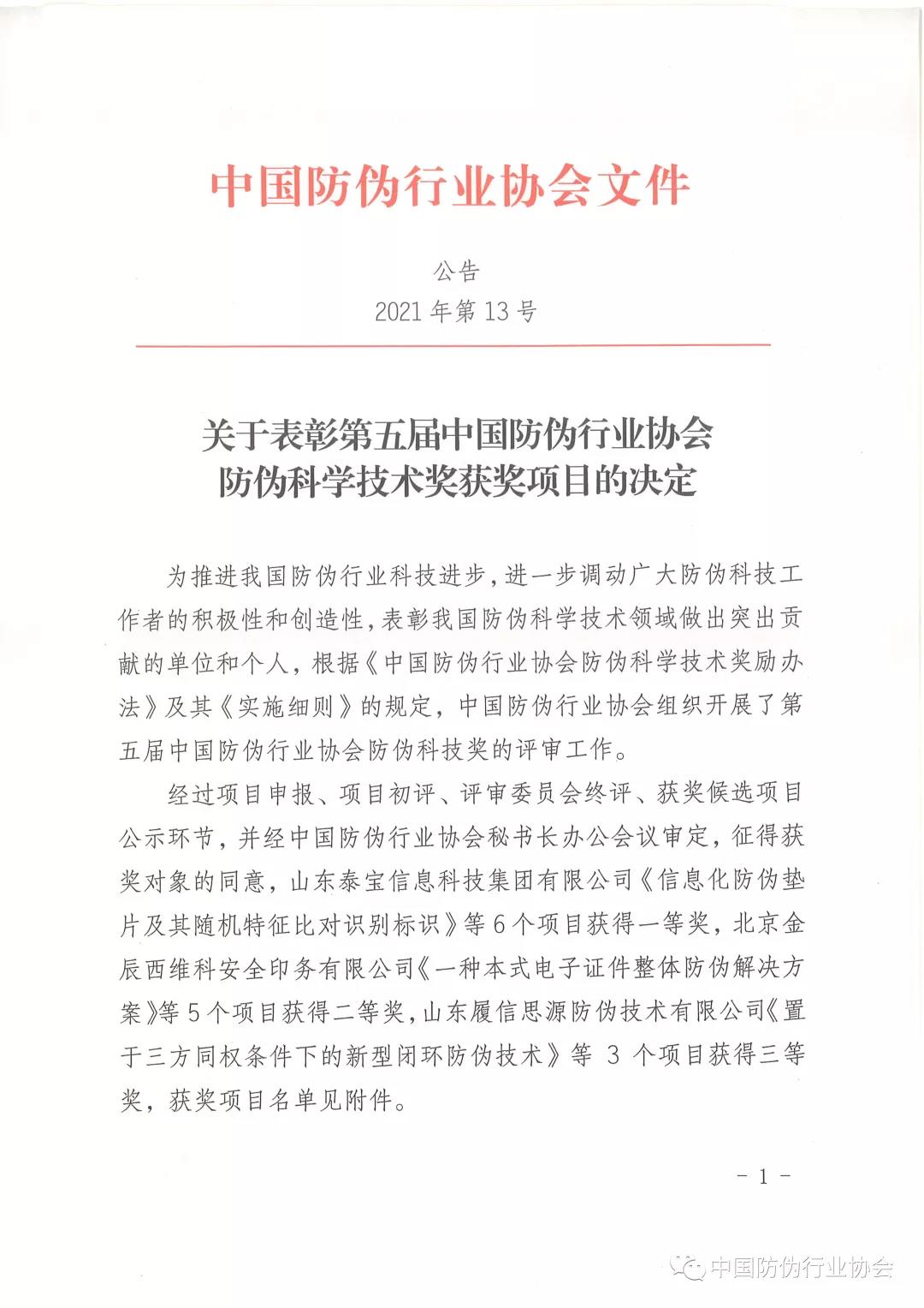關(guān)于表彰第五屆中國(guó)防偽行業(yè)協(xié)會(huì)防偽科學(xué)技術(shù)獎(jiǎng)獲獎(jiǎng)項(xiàng)目的決定